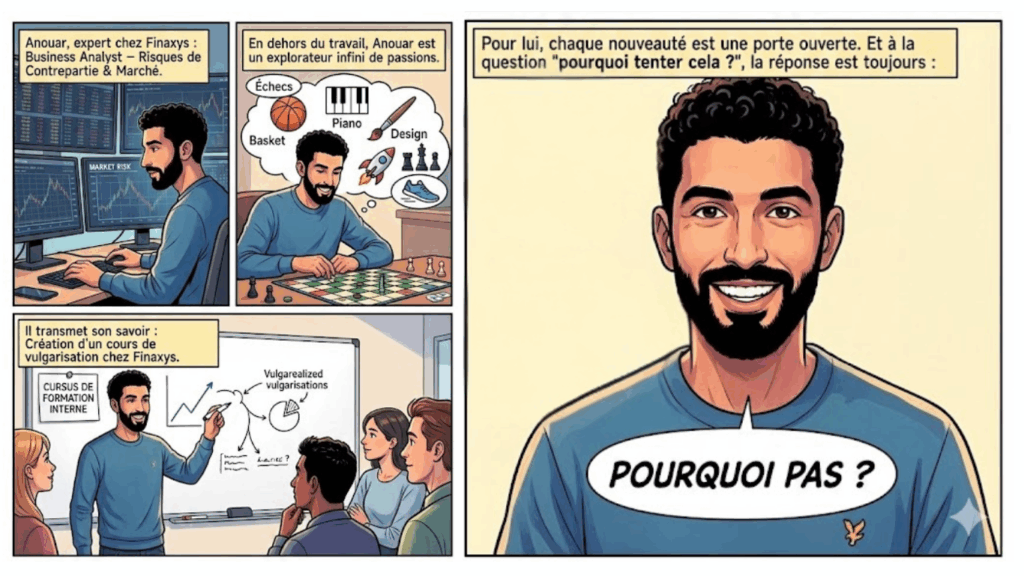 Pour Anouar, l’expertise n’a de sens que si elle est partagée. C’est ainsi qu’est né son projet phare actuel : la création d’un parcours de formation en finance au sein de Finaxys. Son objectif ? Rendre les produits dérivés et les mécanismes de risque accessibles à tous, des RH aux Sales, en passant par les consultants juniors.